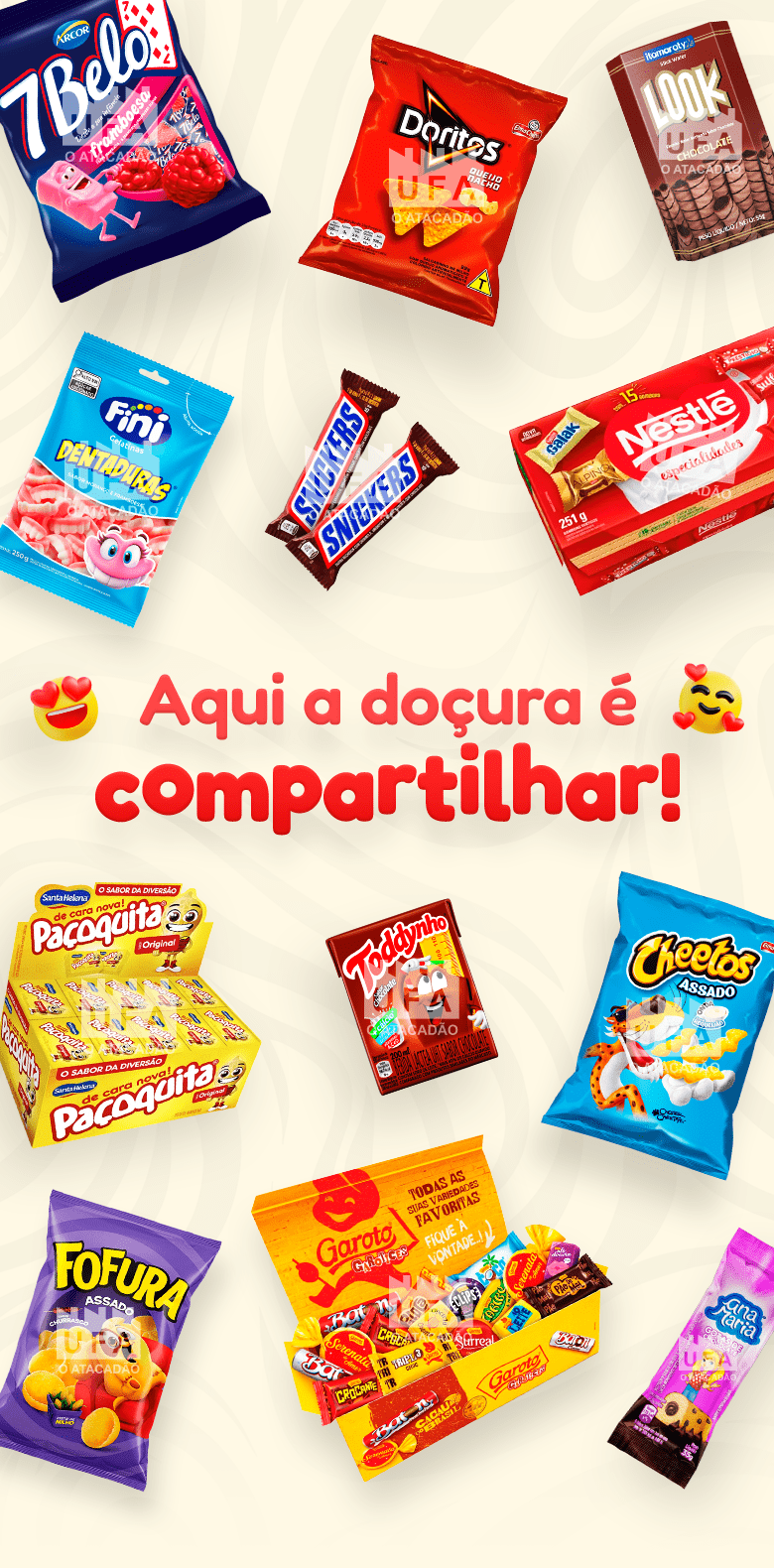 Há mais de 45 anos, a UFA – O Atacadão é sinônimo de sabor e celebração. Reconhecidos como o “Cosme e Damião dos cariocas”, somos referência em levar qualidade, variedade e economia para as celebrações mais especiais. Acreditamos que compartilhar um doce é compartilhar felicidade.